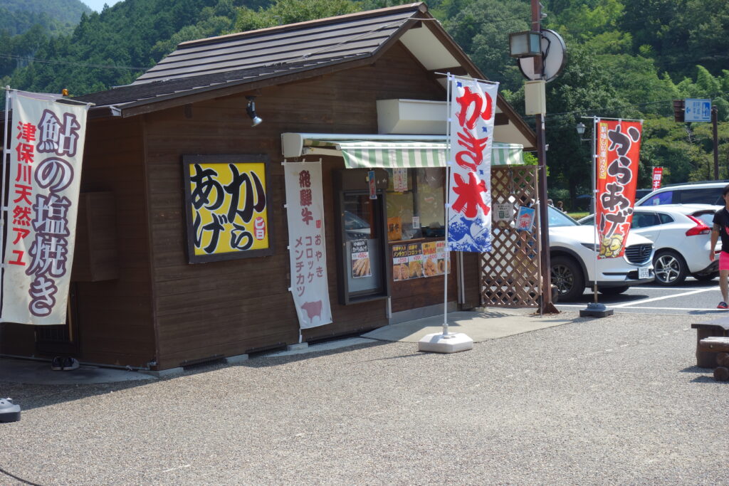 道中の路肩にある五代目食堂は2025年現在も営業中だそうです。木曽川側は廃墟群があります。